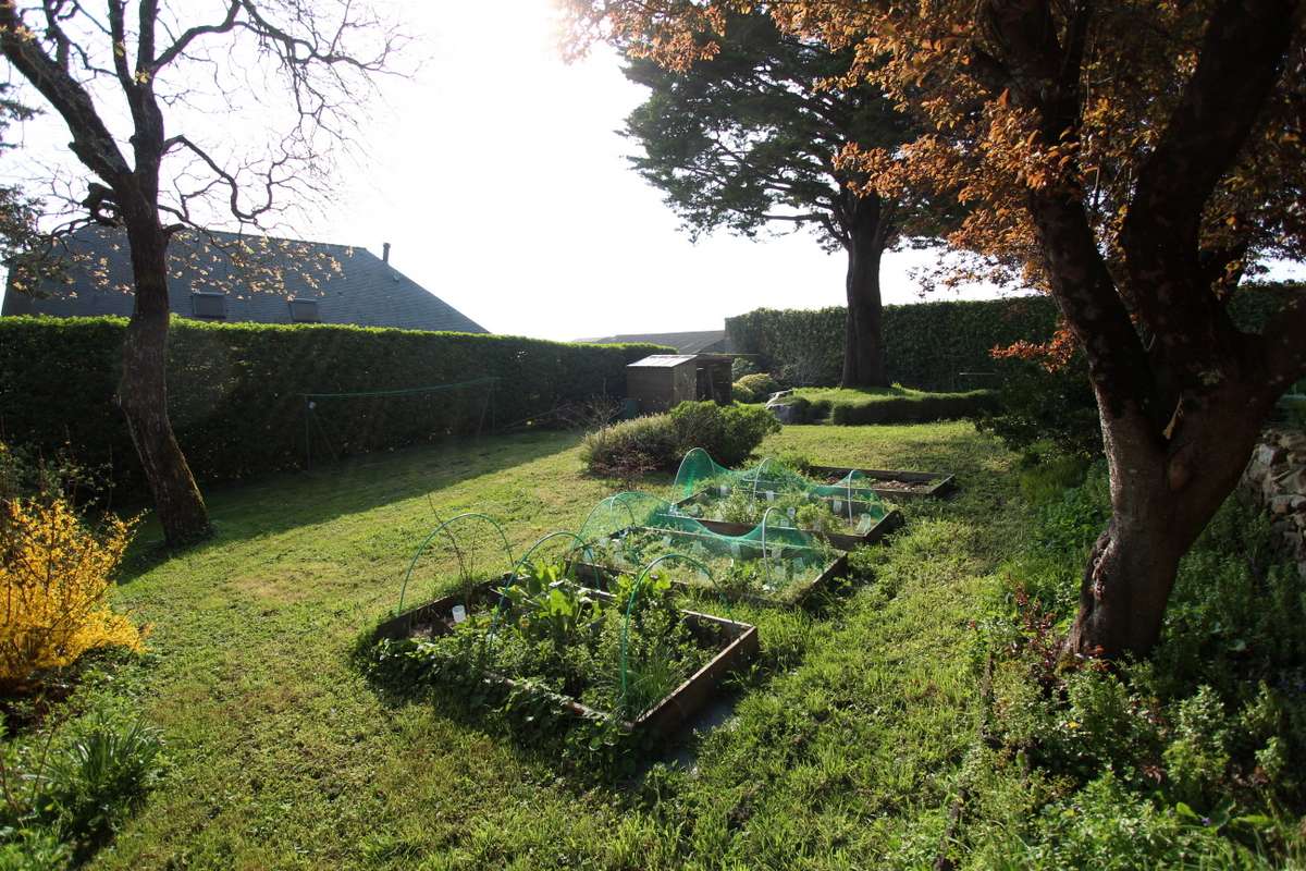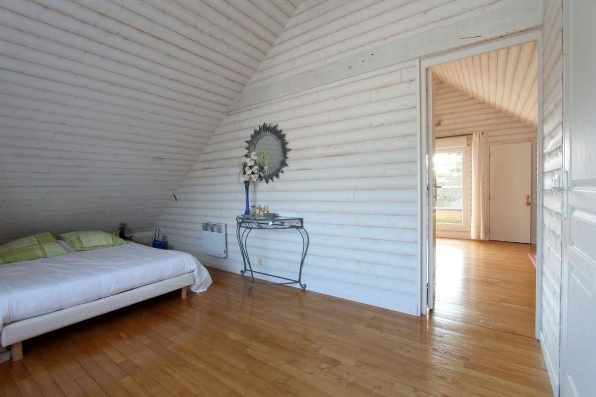 À l’étage, 2 chambres (10 et 16m²), salle de bains avec WC. Vue sur le jardin et la mer au loin.