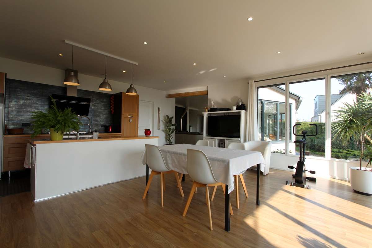 Pièce de vie séjour-repas-cuisine d’environ 50m² ouvrant également au sud par de grandes baies vitrées donnant sur le jardin et la vue sur mer. Aménagement de cuisine moderne avec îlot central et arrière cuisine.