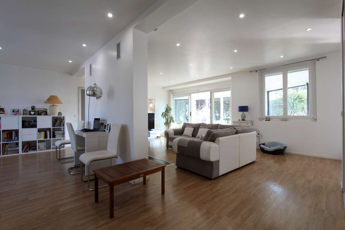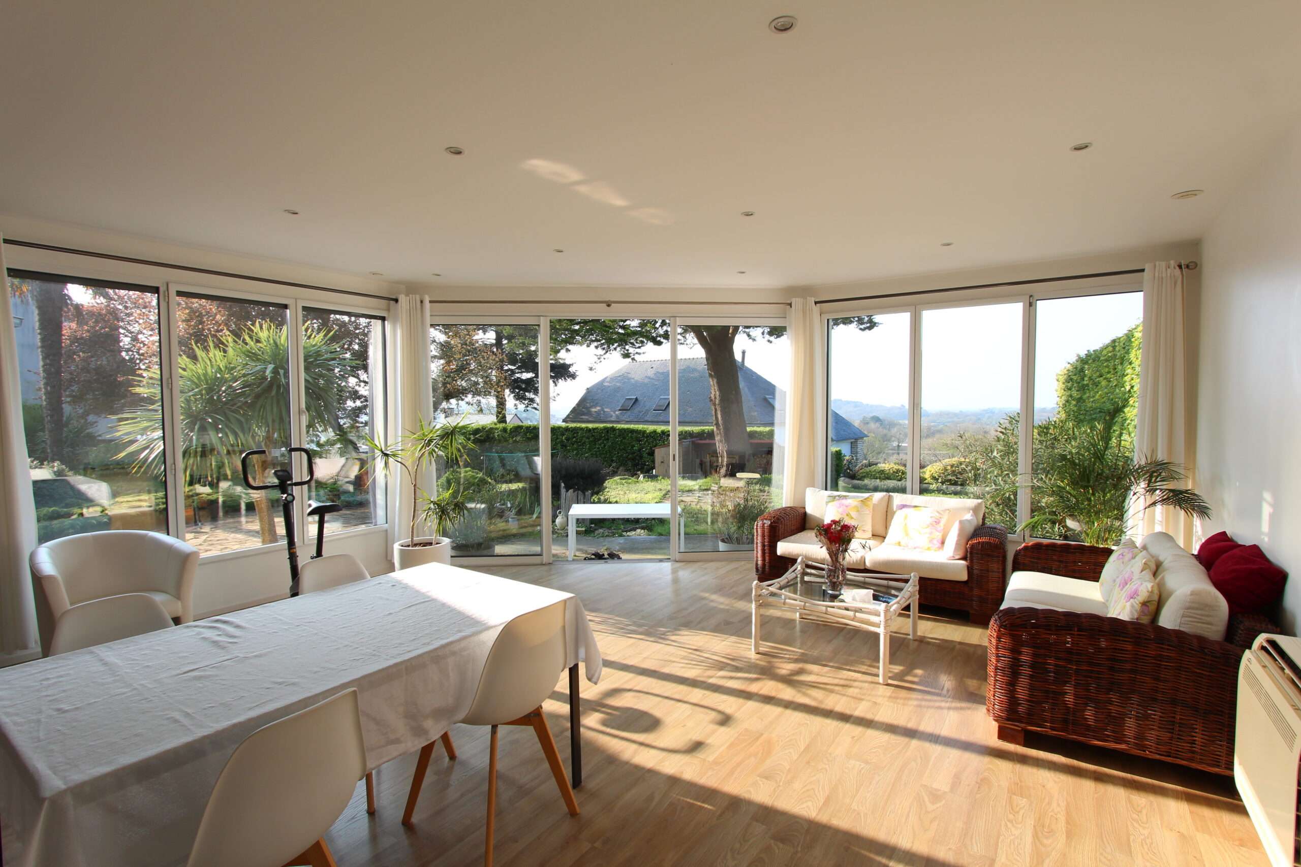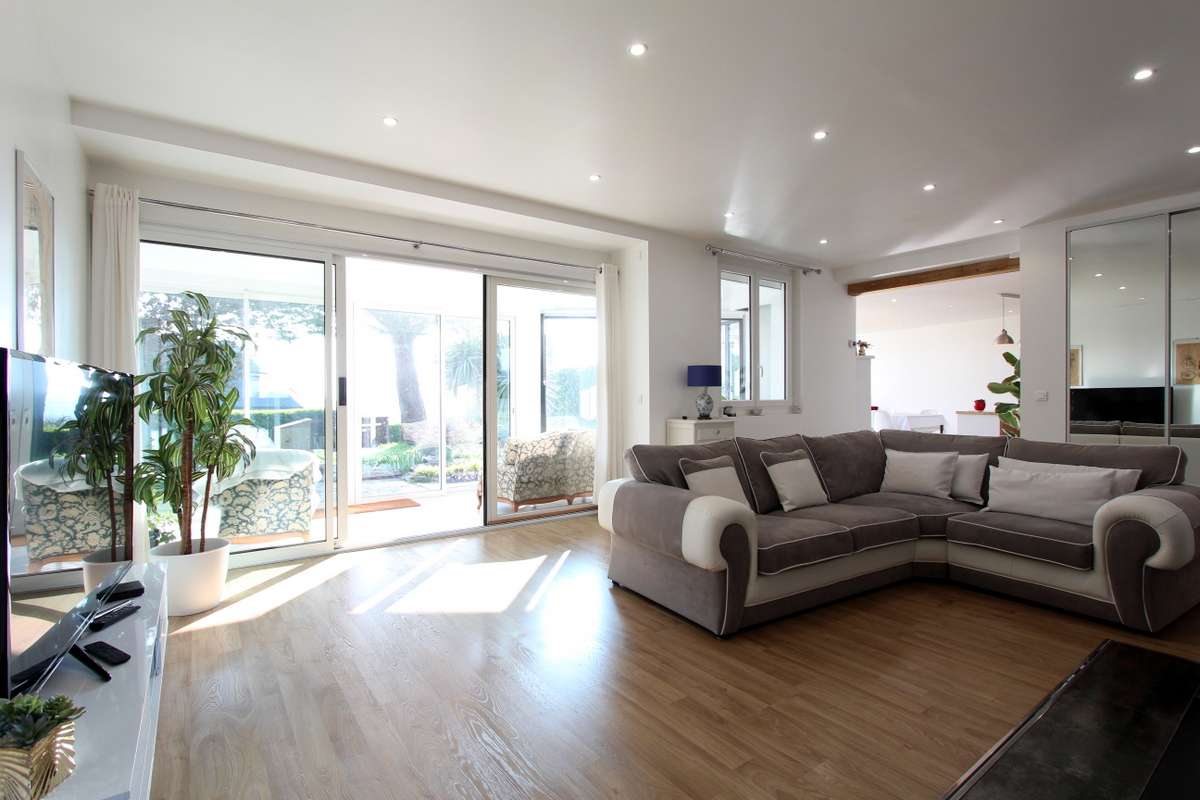 Salon détente d’environ 40m² ouvrant au sud sur une véranda donnant sur le jardin.